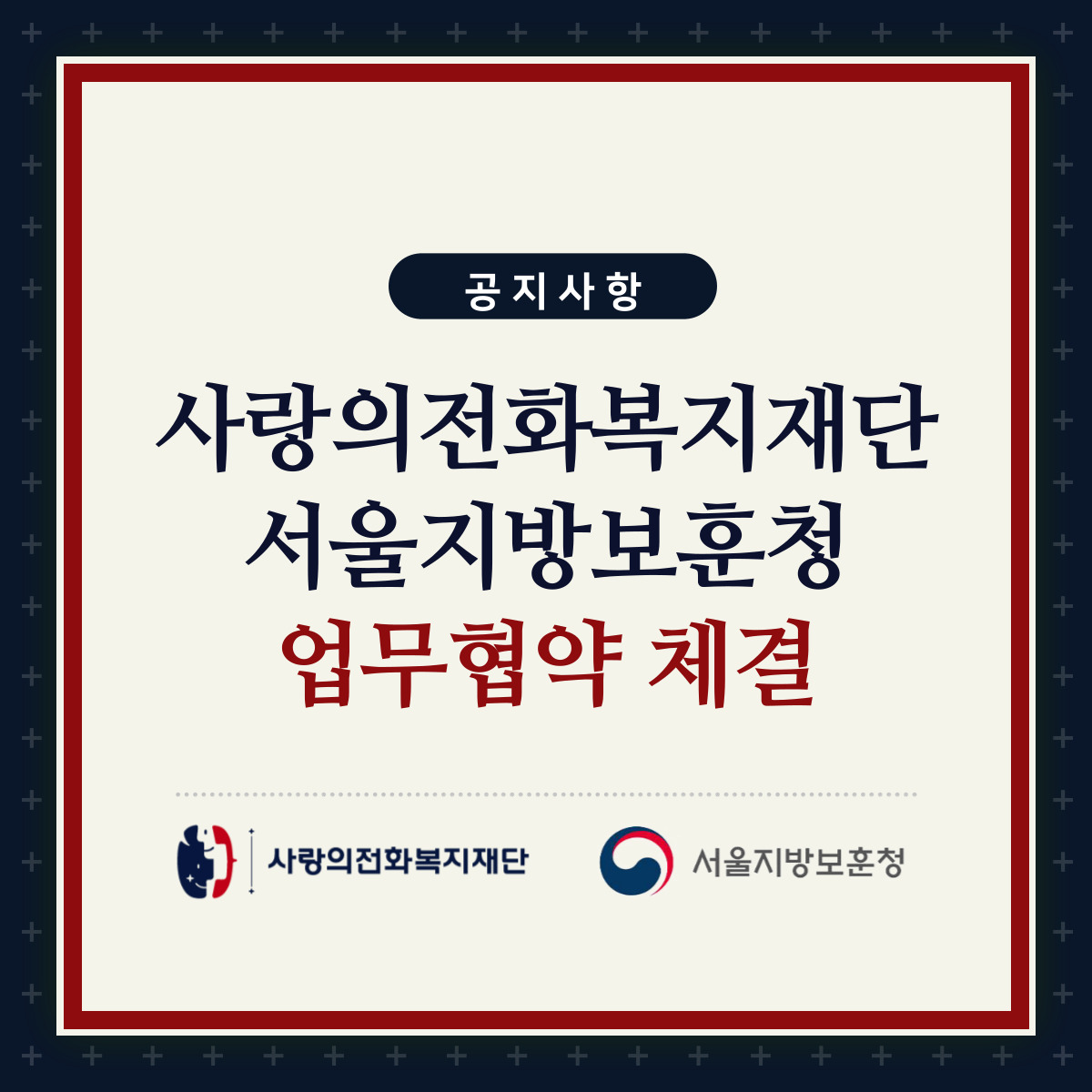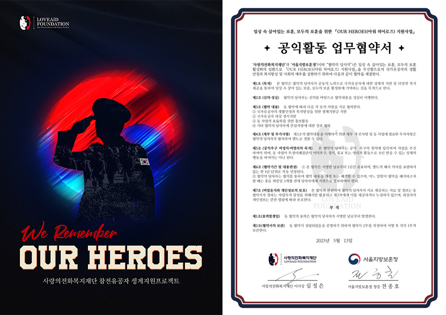 사랑의전화복지재단은 5월 13일 국가보훈부 서울지방보훈청과 함께 6·25 참전유공자 생계지원 프로젝트 ‘아워 히어로즈(Our Heroes)’에 관한 업무협약(MOU)을 체결했습니다.